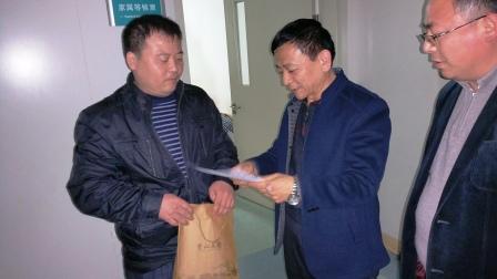 集團(tuán)工會(huì)主席把匯聚愛(ài)心的捐款送到職工王德峰手中