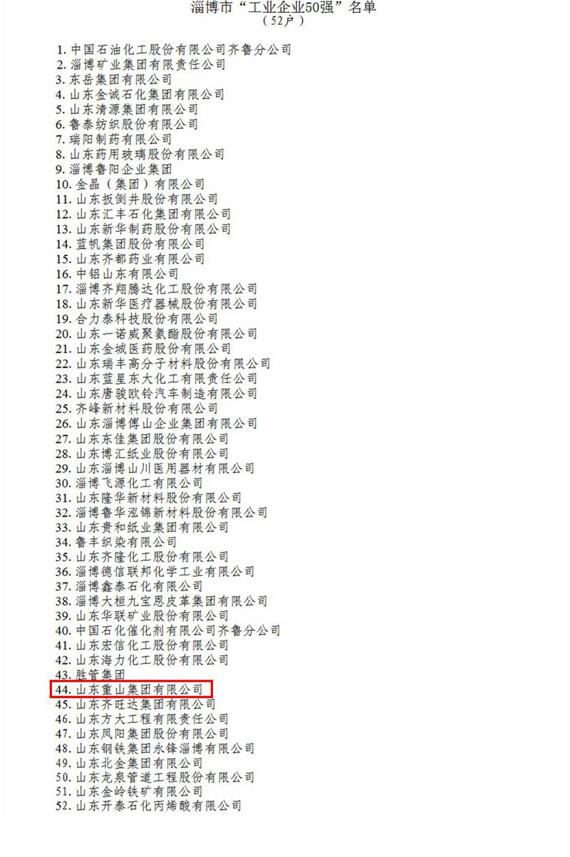 山東重山集團(tuán)榮獲2017年度淄博市“工業(yè)企業(yè)50強(qiáng)”