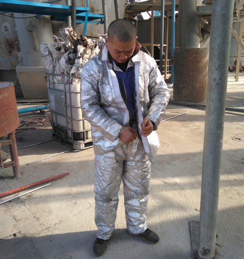 操作工周京文正在穿戴防護服為投運廢噸包做準備