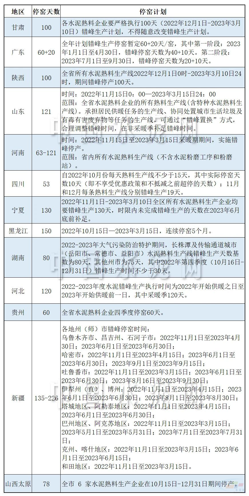 據(jù)中國水泥網(wǎng)不完全統(tǒng)計,廣東、甘肅、河北、陜西、山東、河南、四川、寧夏等十余地區(qū)發(fā)布了2022-2023秋冬季錯峰停窯計劃如下:
