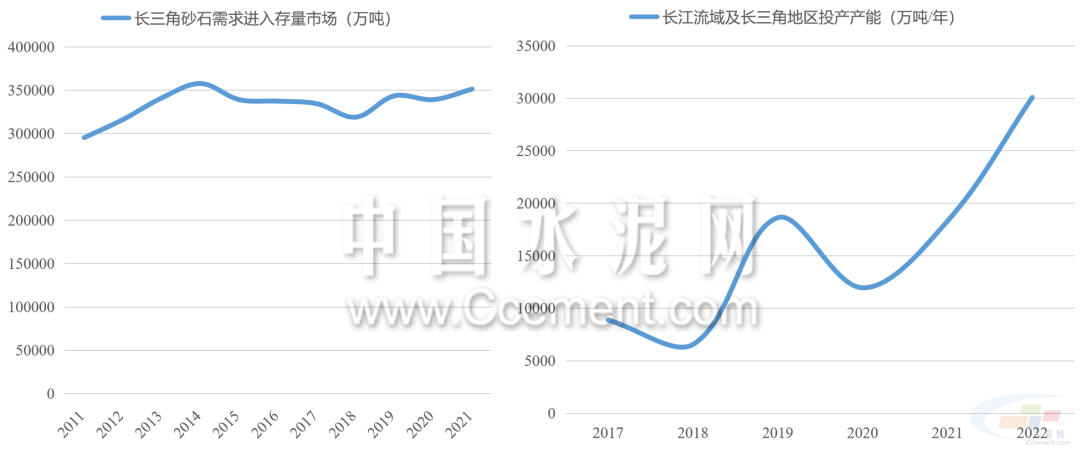 近年來長江中下游城市的砂石骨料需求趨于平穩(wěn),2015年后江浙滬皖地區(qū)的砂石骨料需求量圍繞34億噸均線上下震蕩,長三角地區(qū)需求進(jìn)入存量市場。但是,2017年至2022年,除青海西藏外,長江流域省市(含浙江)每年投放的砂石骨料產(chǎn)能翻了三倍。長江流域面臨供給過剩危機(jī),長期價格或進(jìn)入下行區(qū)間。