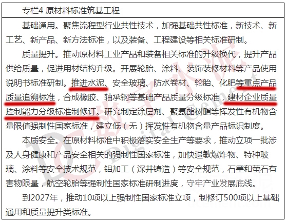 質(zhì)量提升。推動(dòng)原材料工業(yè)產(chǎn)品和裝備相關(guān)標(biāo)準(zhǔn)的升級(jí)換代,提升產(chǎn)品供給質(zhì)量,促進(jìn)用材結(jié)構(gòu)升級(jí)。推進(jìn)水泥、安全玻璃、防水卷材、輪胎、化肥等重點(diǎn)產(chǎn)品質(zhì)量追溯標(biāo)準(zhǔn),建材企業(yè)質(zhì)量控制能力分級(jí)標(biāo)準(zhǔn)制修訂。