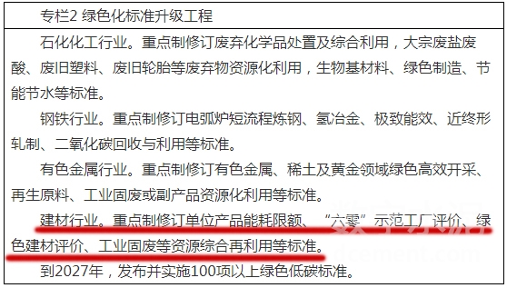 重點(diǎn)制修訂單位產(chǎn)品能耗限額、“六零”示范工廠(chǎng)評(píng)價(jià)、綠色建材評(píng)價(jià)、工業(yè)固廢等資源綜合再利用等標(biāo)準(zhǔn)。