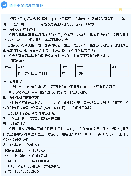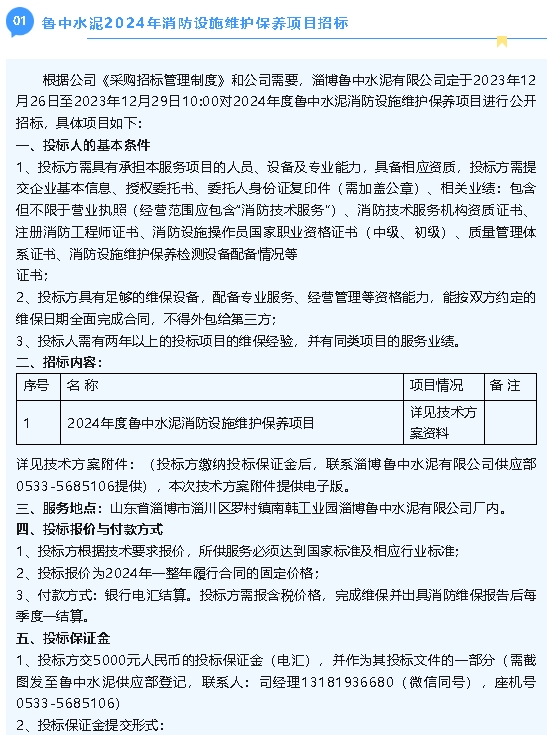【招標(biāo)公告】魯中水泥2024年消防設(shè)施維護(hù)保養(yǎng)項目、澆注料招標(biāo)