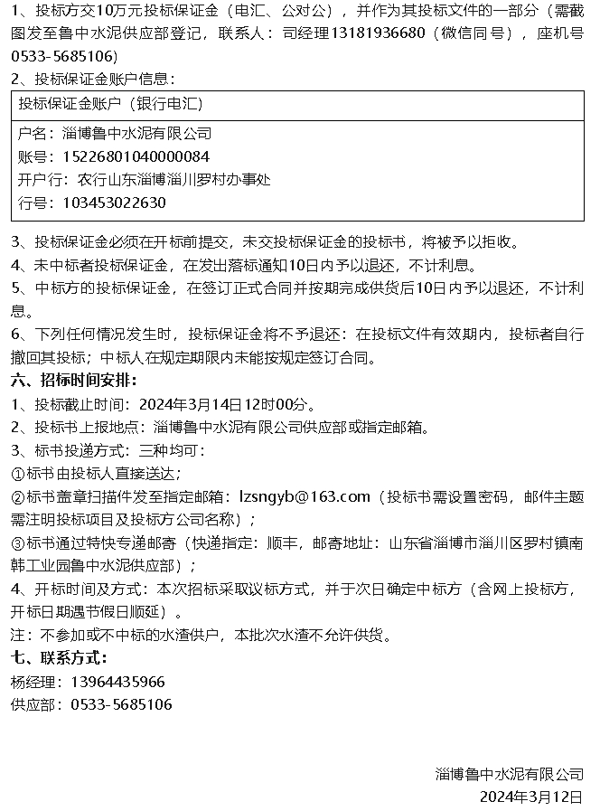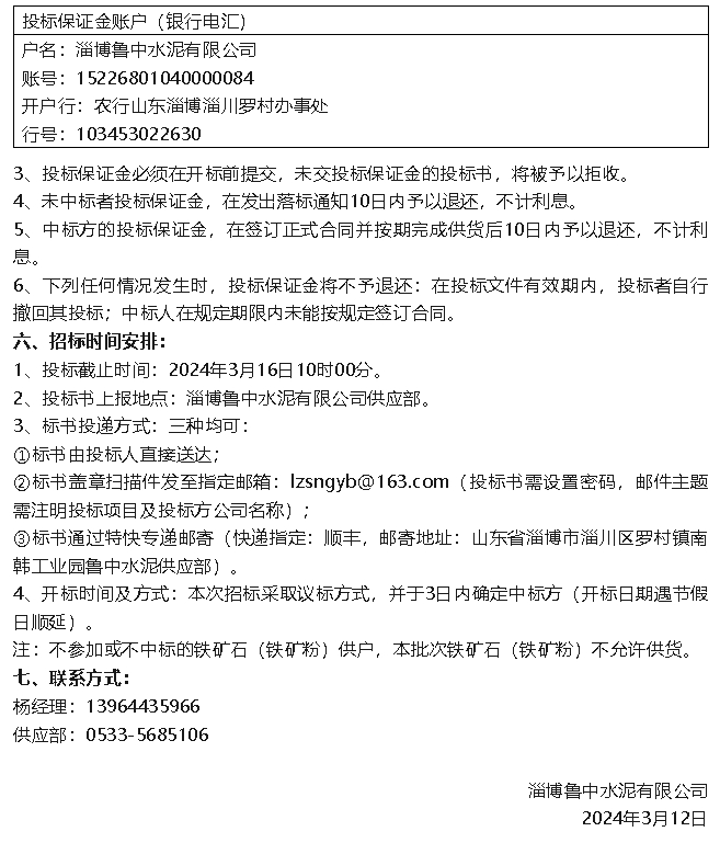 【招標(biāo)公告】魯中水泥水渣、鐵礦石(鐵礦粉) 鵬峰化工導(dǎo)氣管技改項(xiàng)目招標(biāo)