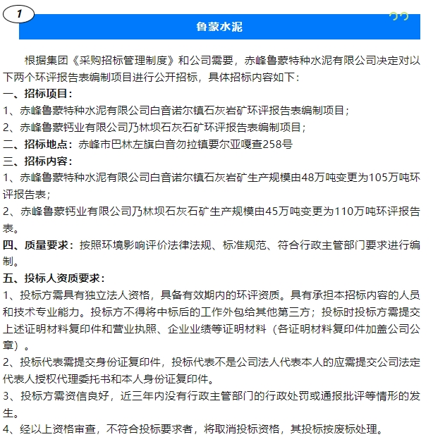 【招標(biāo)公告】魯蒙水泥、鵬峰化工