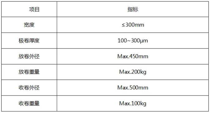 分切機用于輥壓后道工序,將輥壓好的成卷極片分切成兩個或者多個小卷,極片寬度≤350mm,分切寬度為8-128mm,分切速度≥15m/min;刀片為鎢鋼合金刀,刀架為130型??赏ㄟ^更換隔套,實現(xiàn)不同的分切寬度。