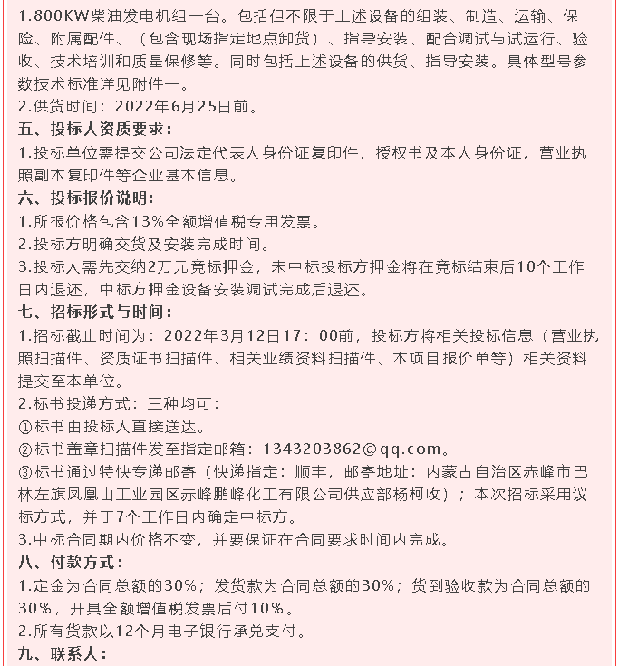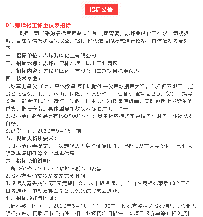 【招標(biāo)公告】鵬峰化工稱重儀表、柴油發(fā)電機、干式變壓器招標(biāo)