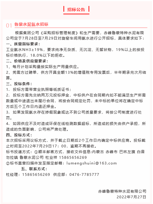 【招標(biāo)公告】魯蒙水泥、鵬峰化工