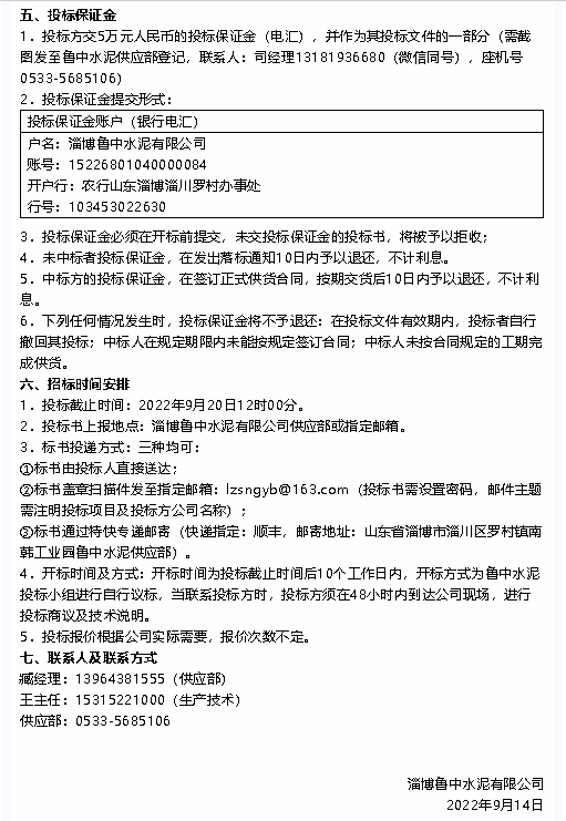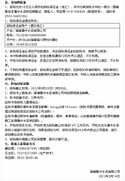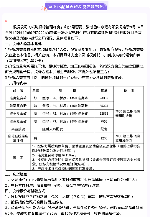 【招標公告】魯中水泥耐火磚及澆注料、硅酸鈣板招標