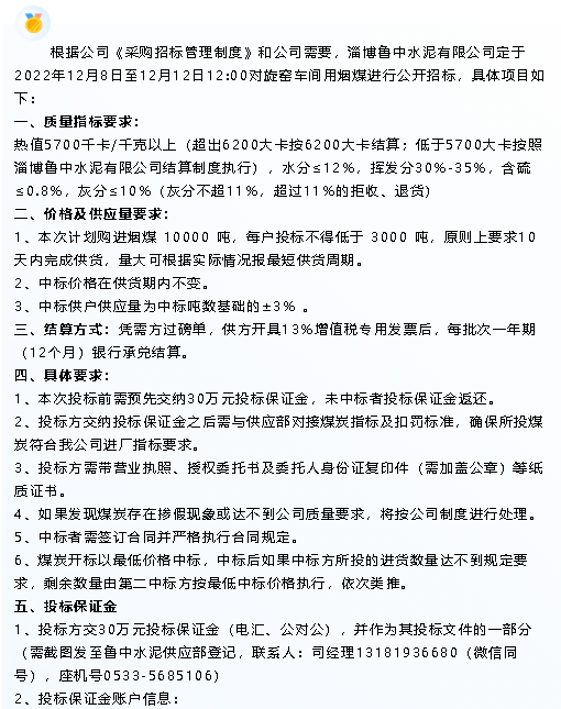 【招標(biāo)公告】魯中水泥
