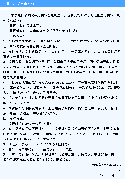 【招標公告】魯中水泥技改工程設備安裝、運輸招標