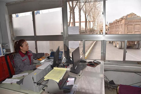 過(guò)磅員董梅在為盤(pán)運(yùn)車(chē)輛“量體重”