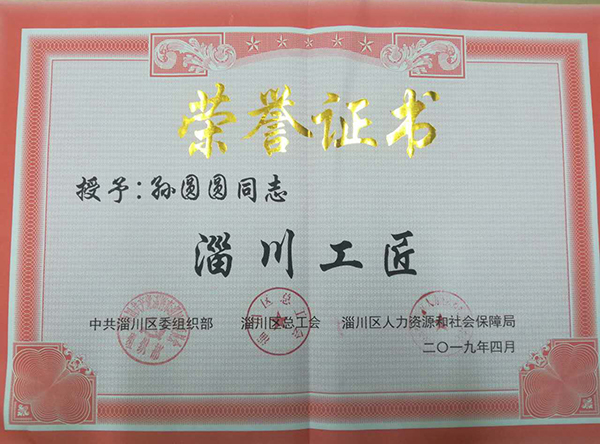 祝賀孫圓圓同志榮獲“淄川工匠”榮譽稱號