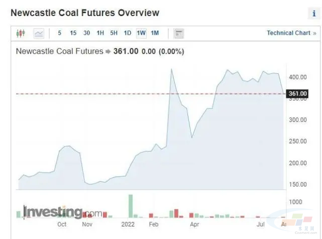由于印度與許多煤炭出口國(guó)都簽有長(zhǎng)期供應(yīng)合同,因此歐盟將不得不和印度展開(kāi)激烈的競(jìng)爭(zhēng)。此前,由于市場(chǎng)供應(yīng)緊缺,澳大利亞紐卡斯?fàn)柛郜F(xiàn)貨煤炭?jī)r(jià)格在6月22日曾一度達(dá)到402.50美元/噸,創(chuàng)下紀(jì)錄,這也是其史上首次突破400美元/噸。