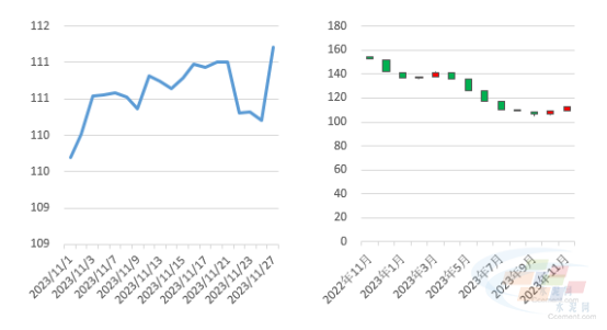 圖為2023年11月全國(guó)水泥價(jià)格指數(shù)CEMPI、水泥價(jià)格指數(shù)(CEMPI)K線圖