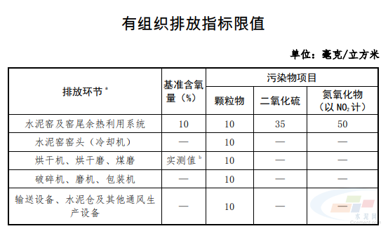(一)有組織排放控制指標(biāo)。在基準(zhǔn)含氧量 10%的條件下,水泥 窯及窯尾余熱利用系統(tǒng)廢氣顆粒物、二氧化硫、氮氧化物排放濃度小時均值分別不高于 10mg/m3、35mg/m3、50mg/m3。其他有組織排放,氨等表中未作規(guī)定的按國家或地方標(biāo)準(zhǔn)執(zhí)行。達到超低排放的水泥企業(yè)每月生產(chǎn)時間至少 95%以上時段排放濃 度小時均值滿足上述要求。