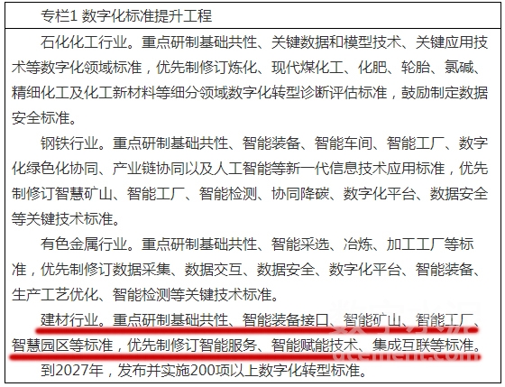 建材行業(yè)。重點(diǎn)研制基礎(chǔ)共性、智能裝備接口、智能礦山、智能工廠(chǎng)、智慧園區(qū)等標(biāo)準(zhǔn),優(yōu)先制修訂智能服務(wù)、智能賦能技術(shù)、集成互聯(lián)等標(biāo)準(zhǔn)。