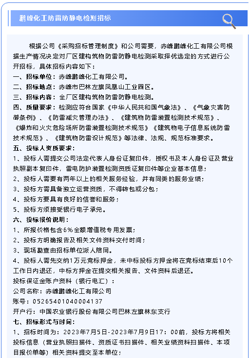 【招標公告】鵬峰化工