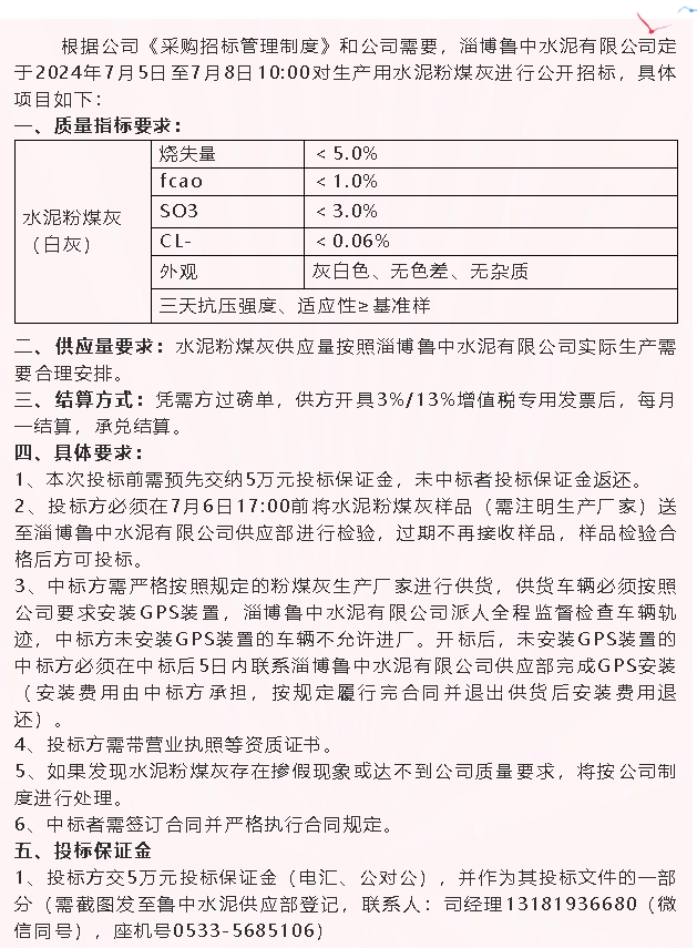 【招標公告】魯中水泥