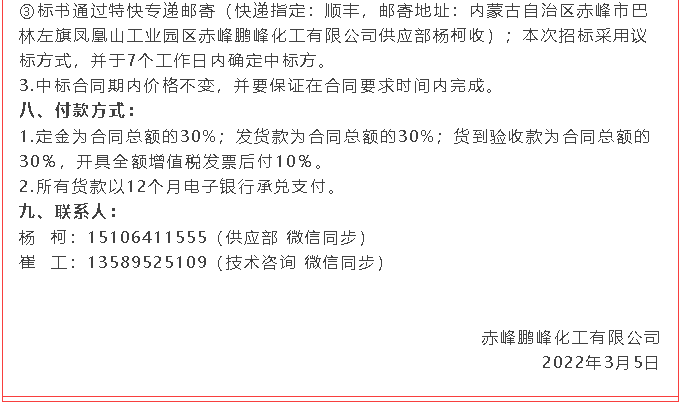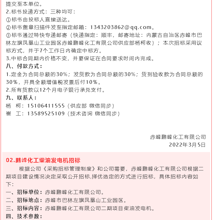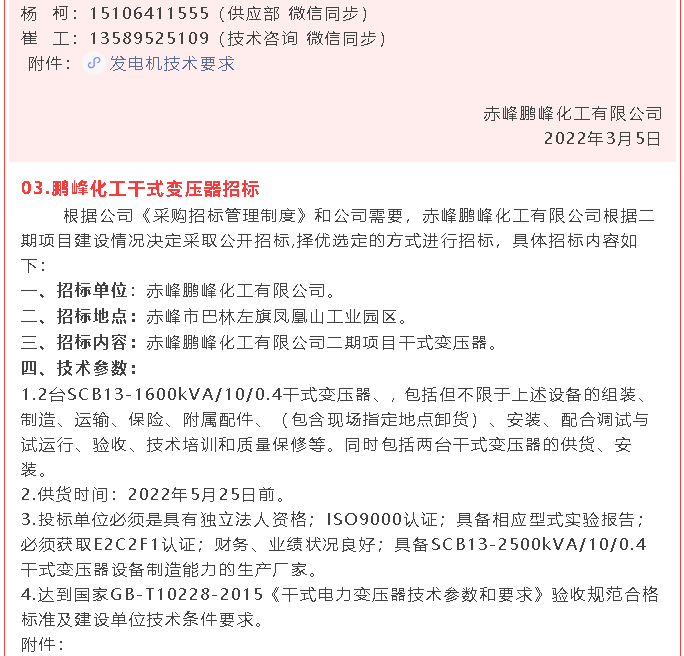 【招標(biāo)公告】鵬峰化工稱重儀表、柴油發(fā)電機、干式變壓器招標(biāo)