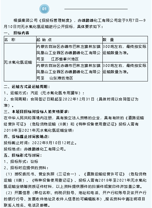 【招標(biāo)公告】鵬峰化工無水氟化氫運(yùn)輸、氣力輸送設(shè)備、有毒有害氣體報(bào)警器招標(biāo)