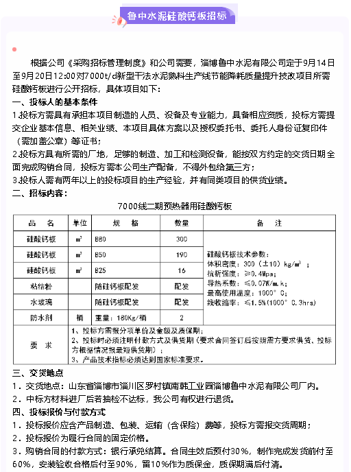 【招標公告】魯中水泥耐火磚及澆注料、硅酸鈣板招標